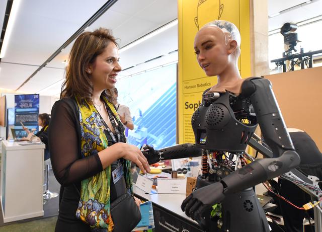 2023年7月7日,在瑞士日内瓦“人工智能造福人类全球峰会”上,一名参会者与仿真机器人索菲亚互动。新华社记者连漪摄