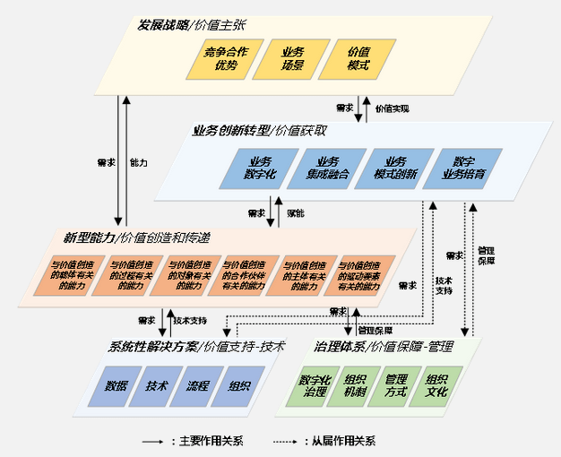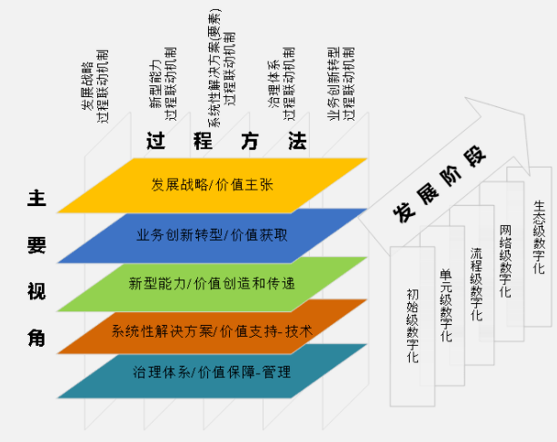 根据数字化转型的新形势、新趋势和新要求,发展战略视角提出新的价值主张。根据价值主张新要求,新型能力视角打造支持价值创造和传递的新型能力(体系)。系统性解决方案视角创新价值支持的要素实现体系,形成支持新型能力打造、推动业务创新转型的系统性解决方案。治理体系视角变革价值保障的治理机制和管理模式,构建支持新型能力打造、推动业务创新转型的治理体系。根据价值主张新要求,基于打造的新型能力(体系)、形成的系统性解决方案和构建的治理体系,业务创新转型视角形成支持最终价值获取的业务新模式和新业态。
