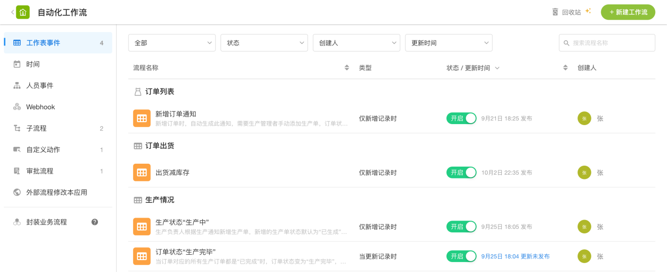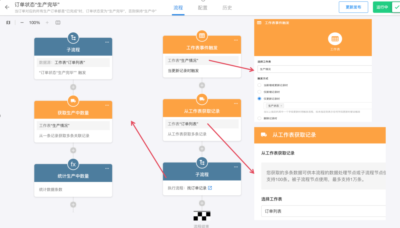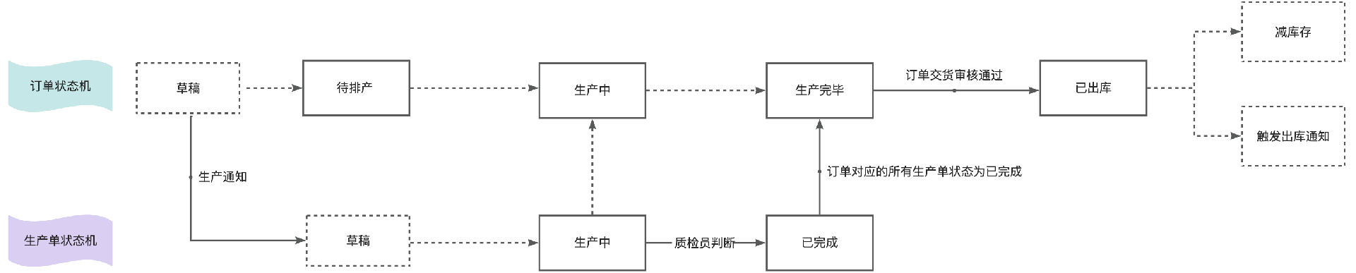 由于订单状态是根据该订单下的所有生产单状态决定的,因此工作流触发节点是由生产记录的状态来控制的。