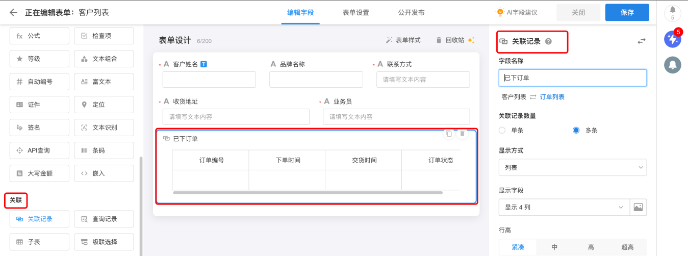 低代码平台中专门提供了一系列的关联控件,支持各种关联关系,下图是为了实现查看当前客户的所有订单记录,在客户信息这一数据表中关联订单信息。