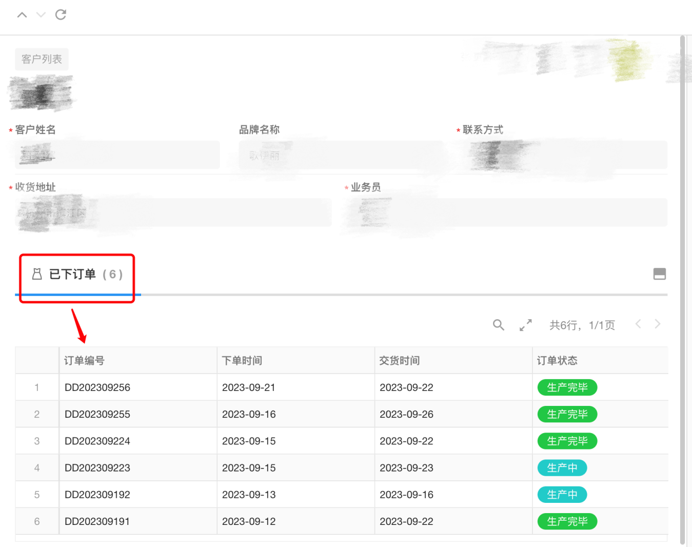 根据ER图可以看出这4张数据表间的关联关系,有一对多和多对多,比如在客户信息详情中,可以看到这个客户历史所有下过的订单信息;在订单详情中可以看到所有产品的生产进度,这在B端产品设计中是一种非常常见的设计形态,那么在低代码平台中是如何实现的呢。