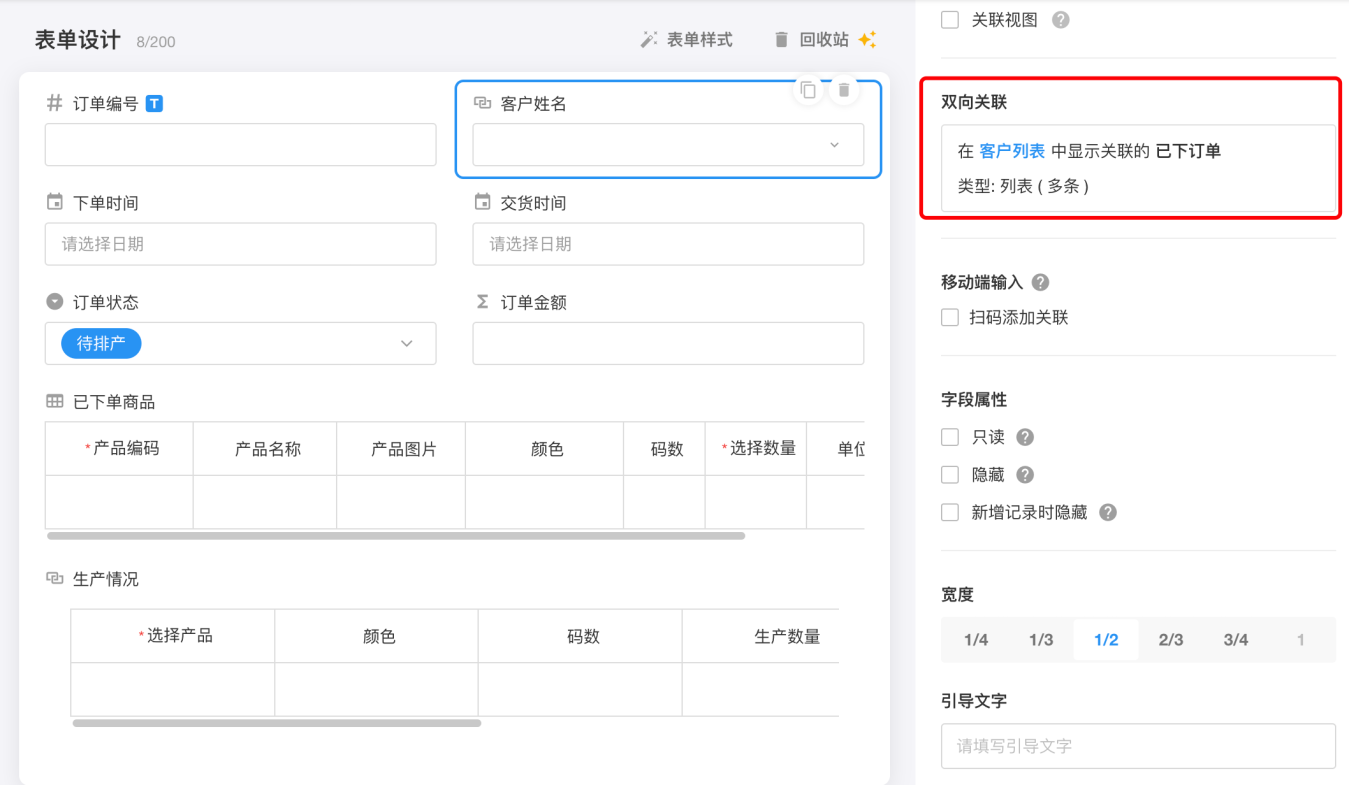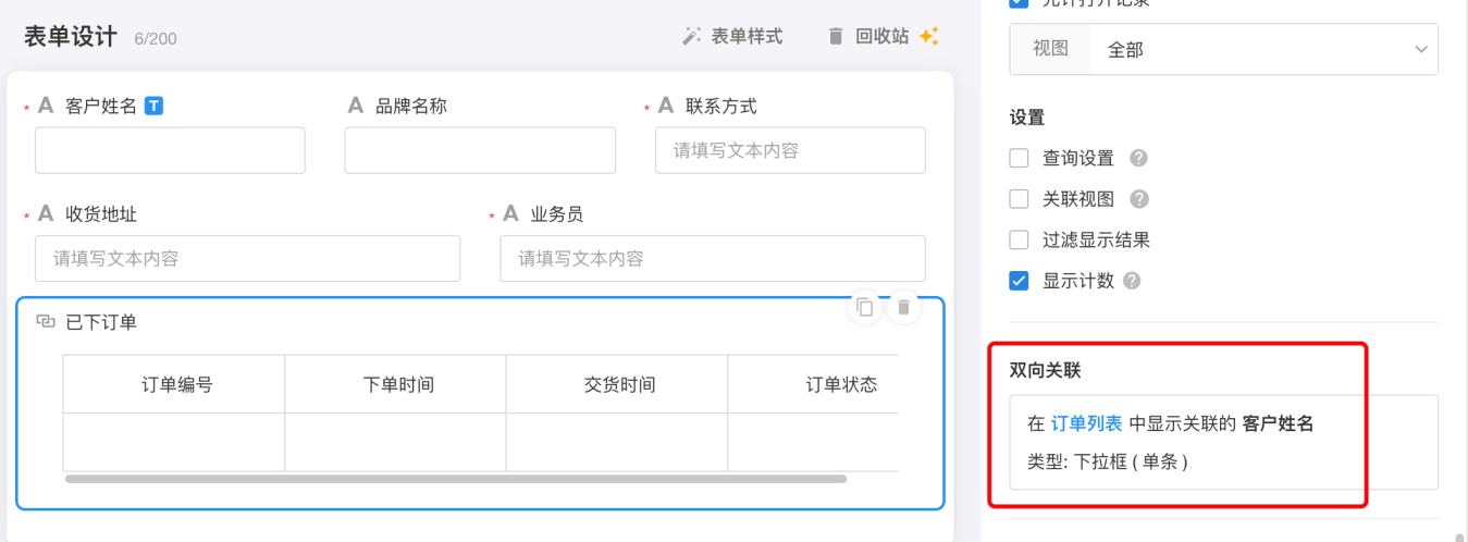 在新建订单时,需要从已有的客户列表中选择客户,因此也需要在订单信息这一关联表中关联客户信息。当两个表的数据需要双向同步时,可以使用双向关联控件来实现效果。