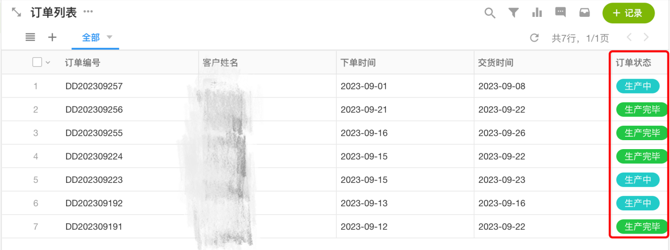 我使用的是明道云的低代码平台来实现上述管理系统的搭建,在前面抽象ER图的过程中,抽象出了4个实体,因此这个系统最基础的4张数据表即:客户列表、订单列表、产品列表和生产列表。